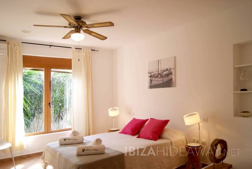 All bedrooms are of a good size and have its own bathroom, three of the bathrooms are en suite, the fourth bathroom on the ground floor is found next to the living room, so it can also be used as a courtesy wc from the lounge and pool area. From the top floor of the villa you get lovely views to the sea and Ibiza old town. additionally the bedrooms on the upper floor have their own, furnished terraces. The villa offers electric blinds in all the bedrooms to black out the sun after a long night out, and the whole villa, including the living area is airconditioned.